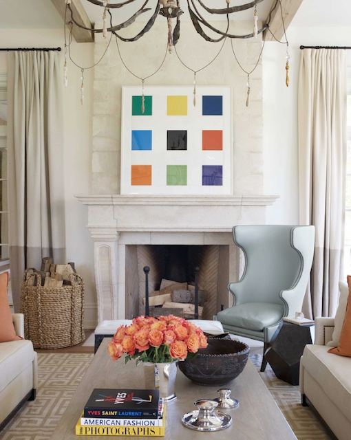 Add visual interest to a space through dramatic lighting and art that may not exactly fit in, but works somehow. In this instance they used a very modern piece of art in a traditional room.